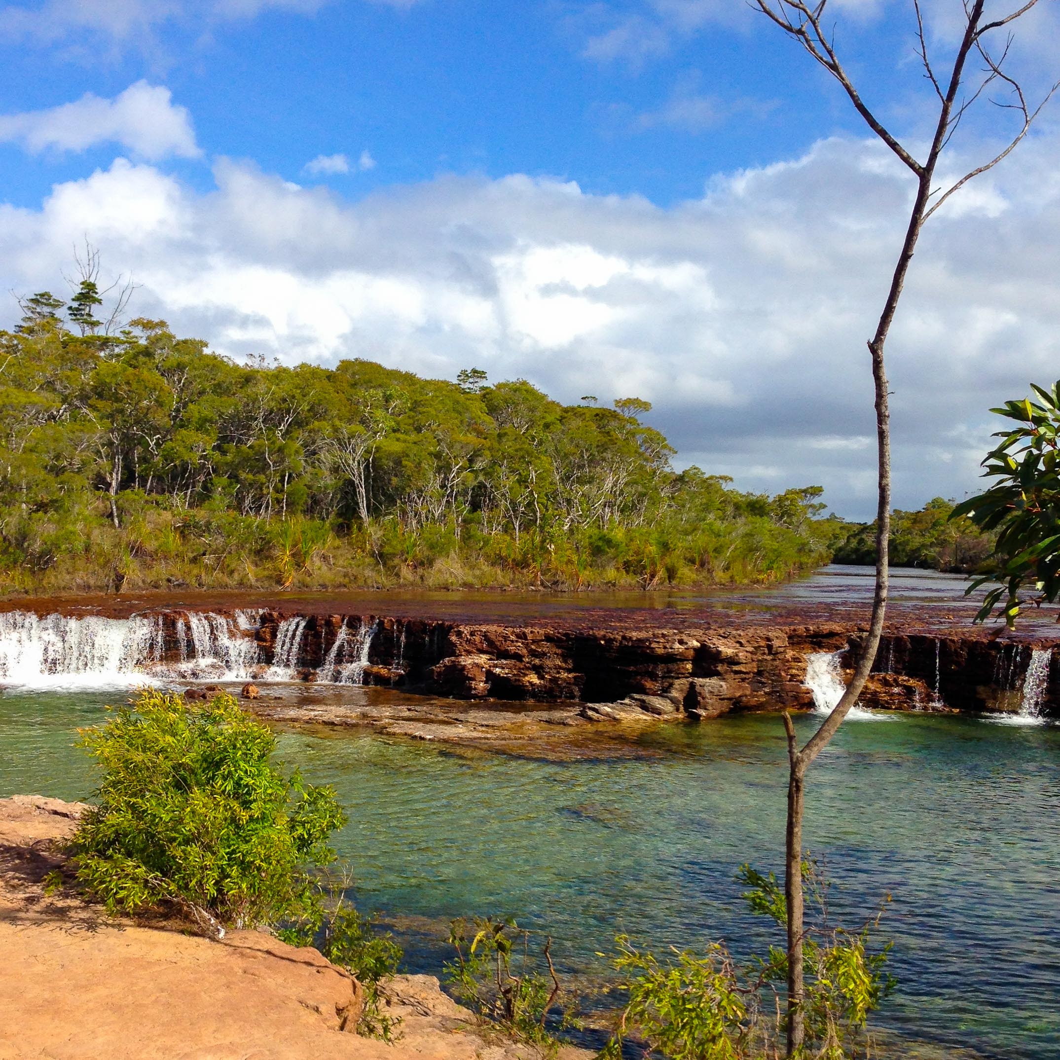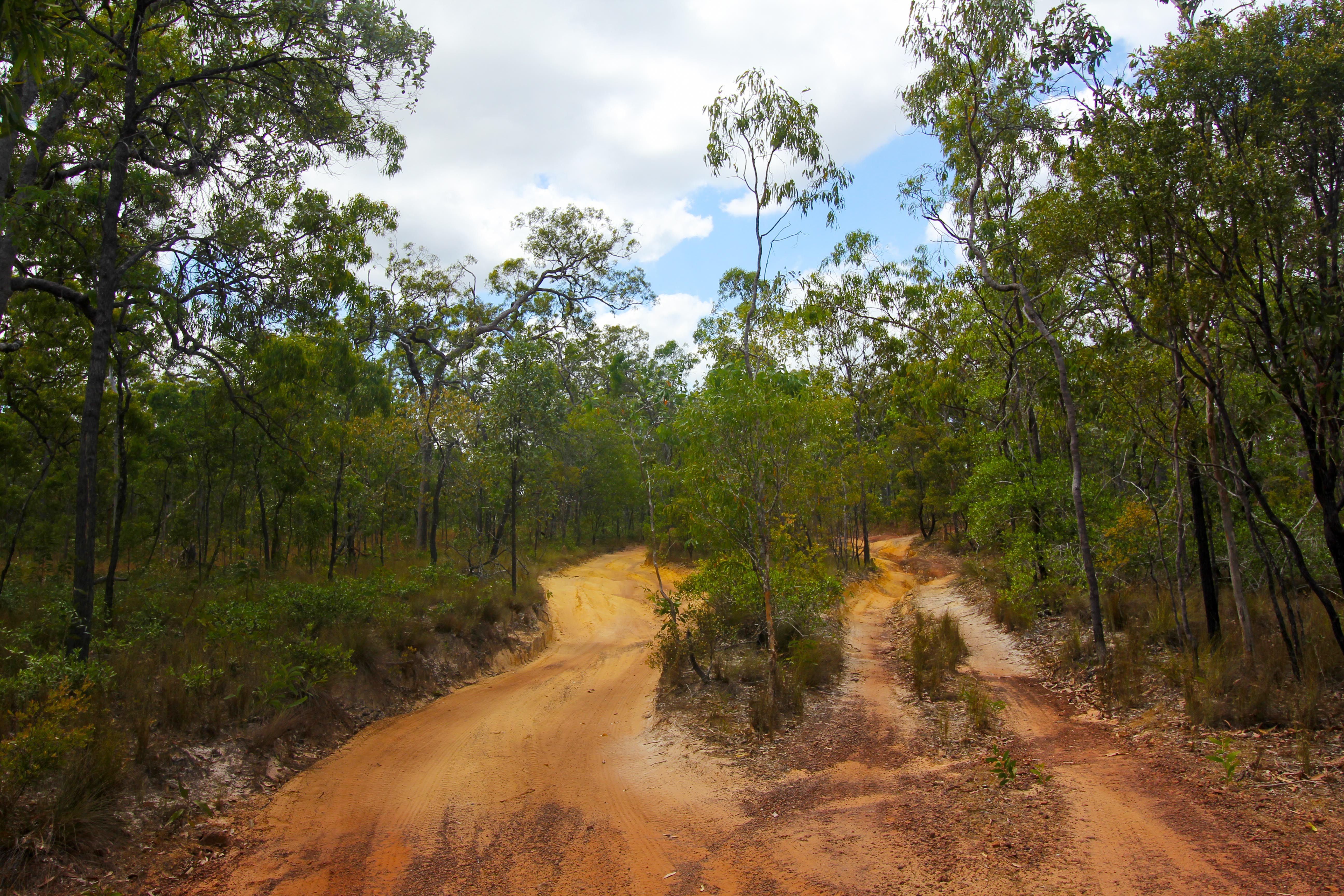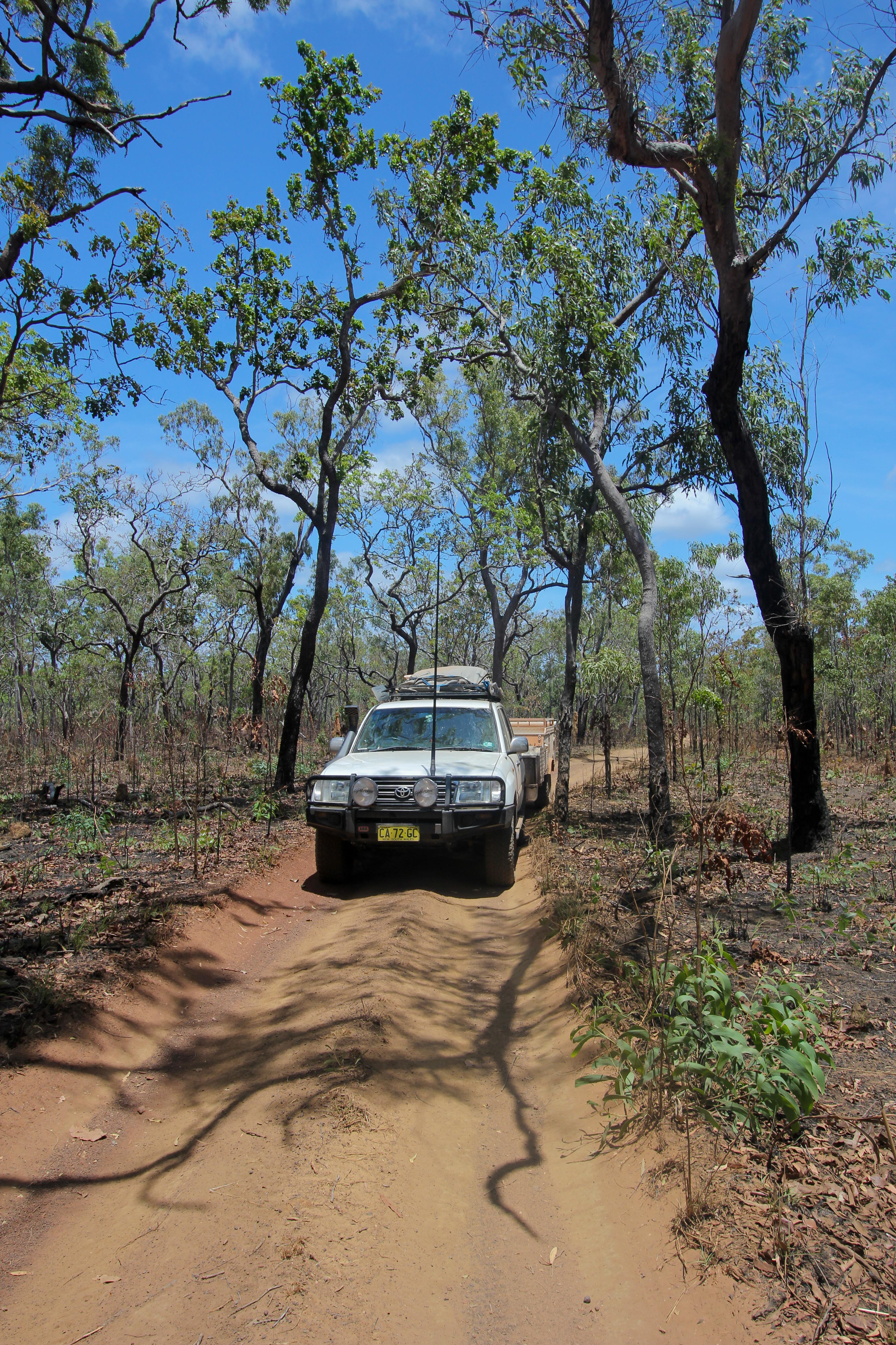 The journey from Palm Creek to our first camp site, the Dulhunty River, was slow going on a rough, narrow track with deep ruts and two more manageable creek crossings, Ducie Creek and North Alice Creek. It took us about three hours to make it the 25 kilometers, or a little over 15 miles, from Palm Creek to Dulhunty. When we got to Dulhunty we took a dip in the water, relaxing by a shallow waterfall, and then set up for a great night of camping. I gathered some firewood and Miranda broke out the camp oven to make roast lamb.