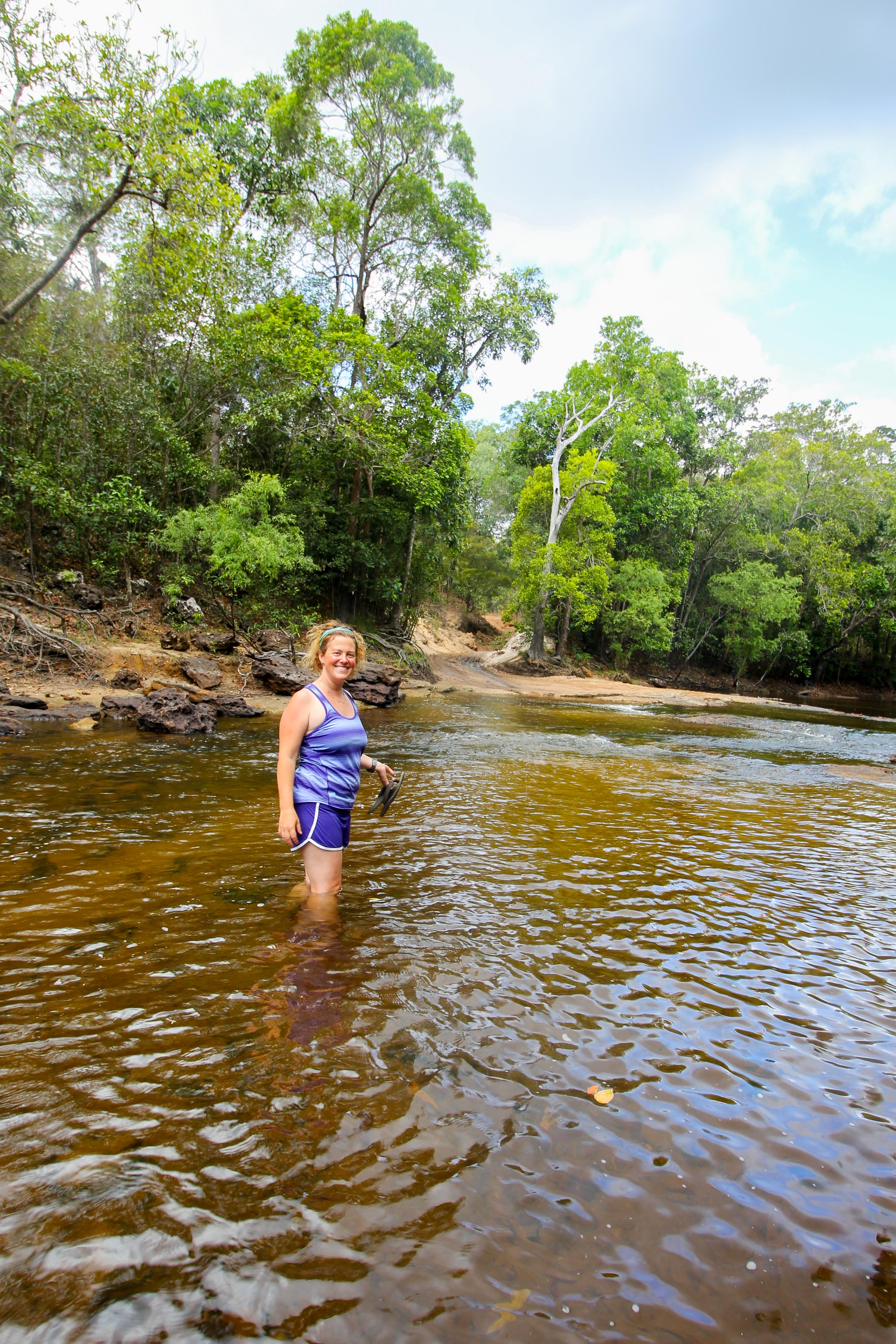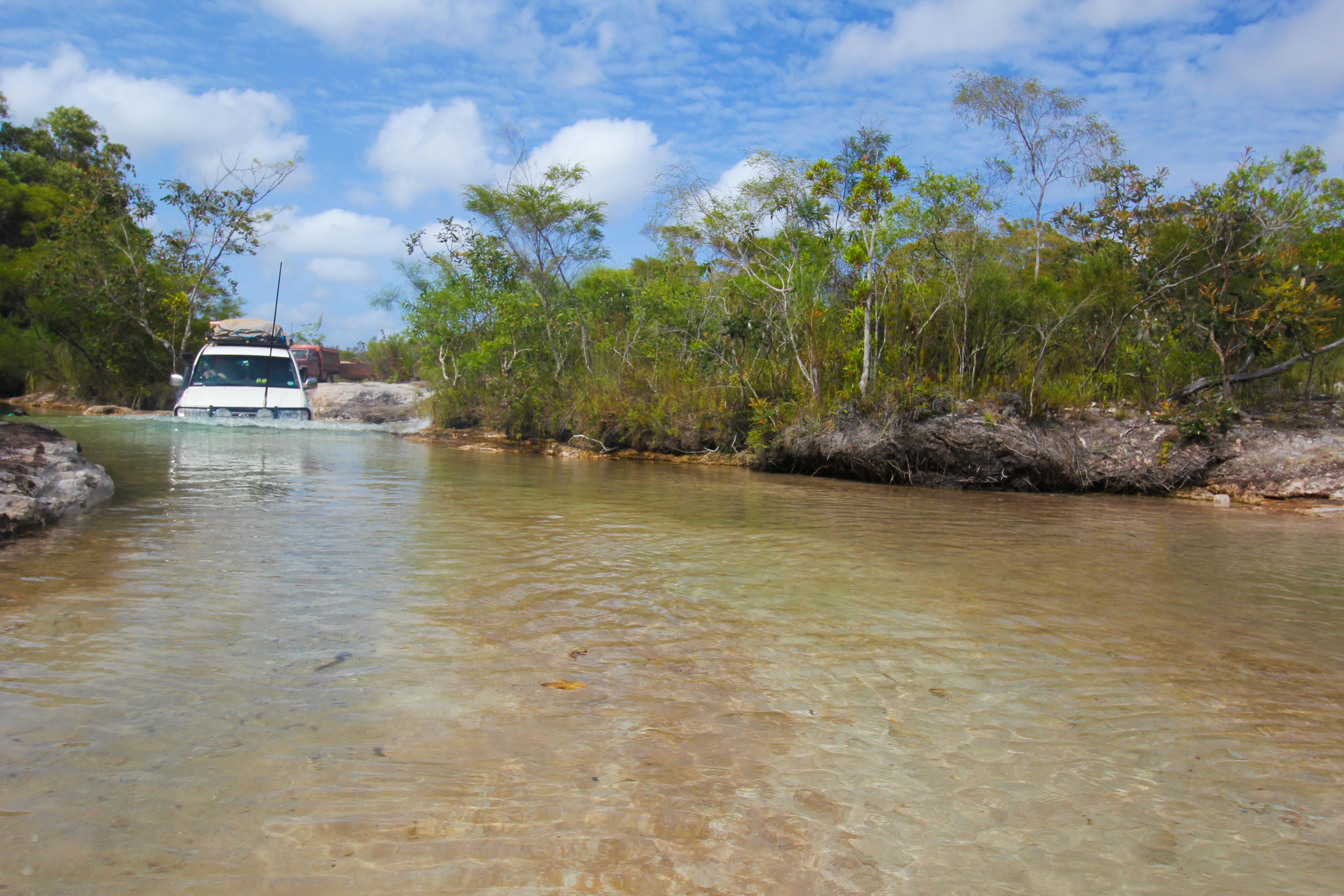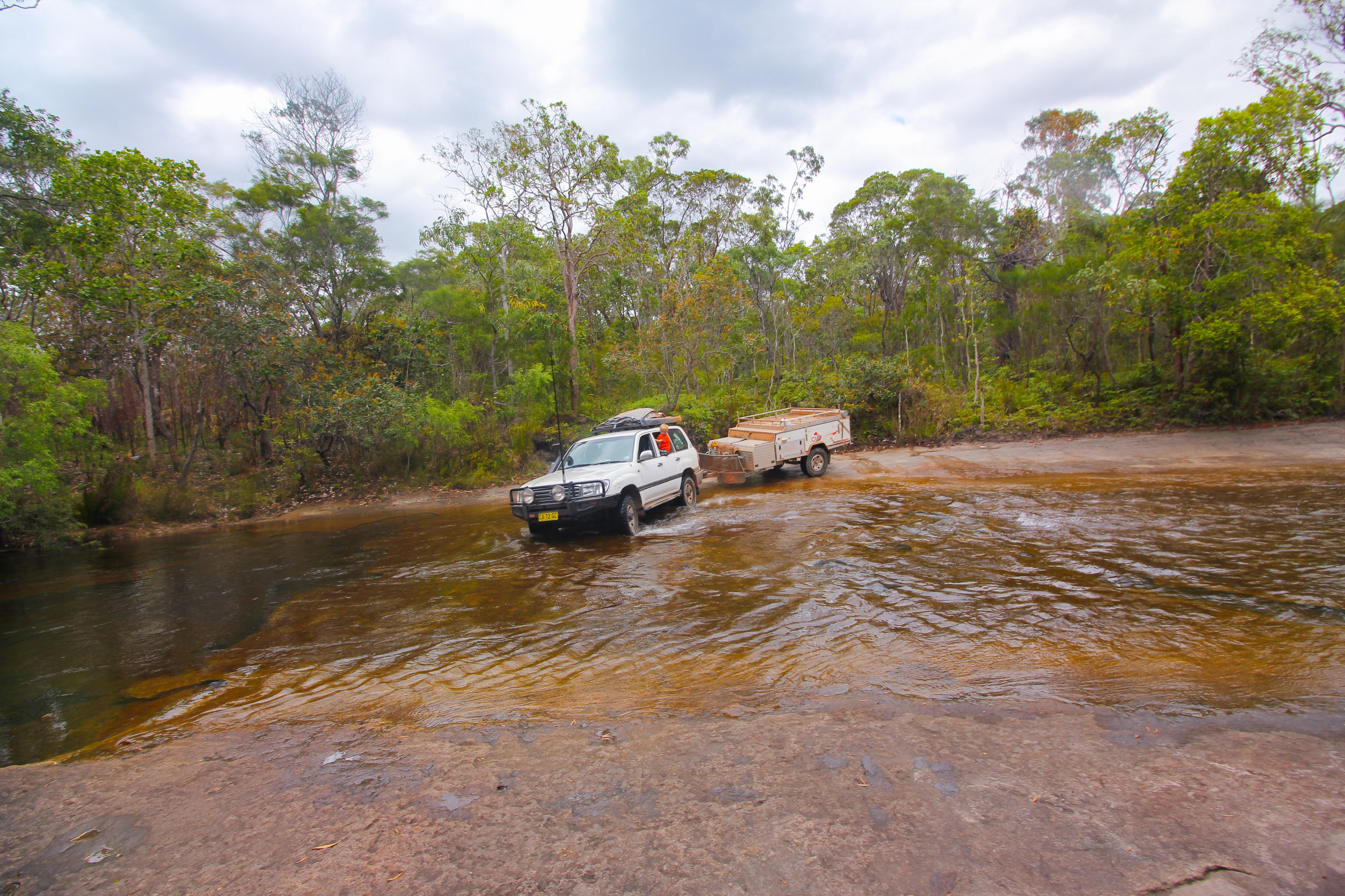 The next morning, after eggs and toast for breakfast, we headed out for day two on the Tele Track. On Mark’s recommendation, we were aiming for the far side of Canal Creek as our goal for the day, which had a large camping area and was just steps away from a swim in clear, croc-free fresh water! We continued to proceed with care on the rough track, with Miranda captaining Cave Lion for the majority of the day. There were several crossings on the agenda for the day: the Dulhunty River, Bertie Creek, Sailor Creek, Cockatoo Creek, and of course the infamous Gunshot Creek. Each of these crossings had their own “trick” to passing safely, many of which were shared by Mark or our guidebook, and confirmed by walking the crossing first, looking for holes, obstacles and checking water depth.