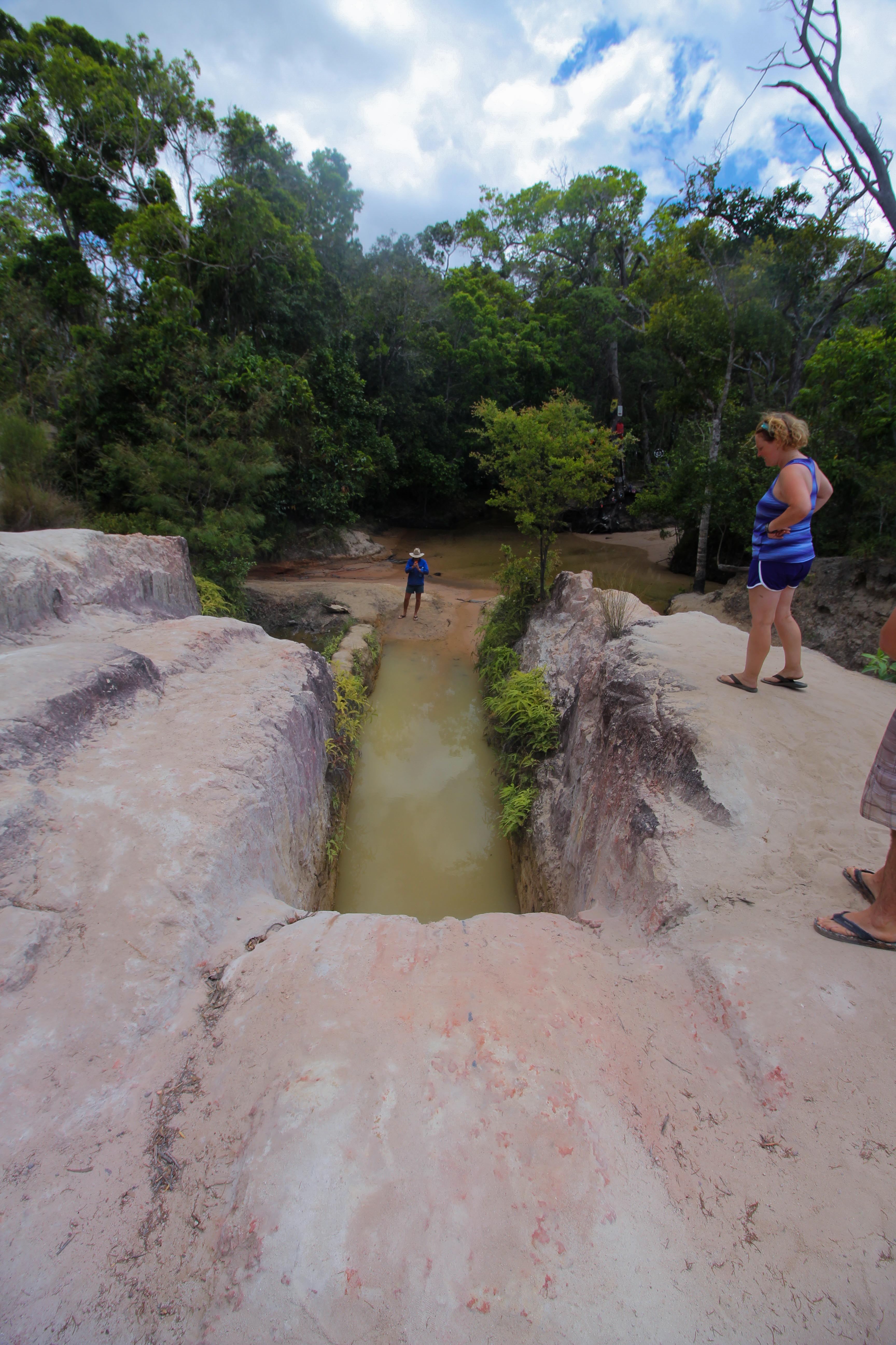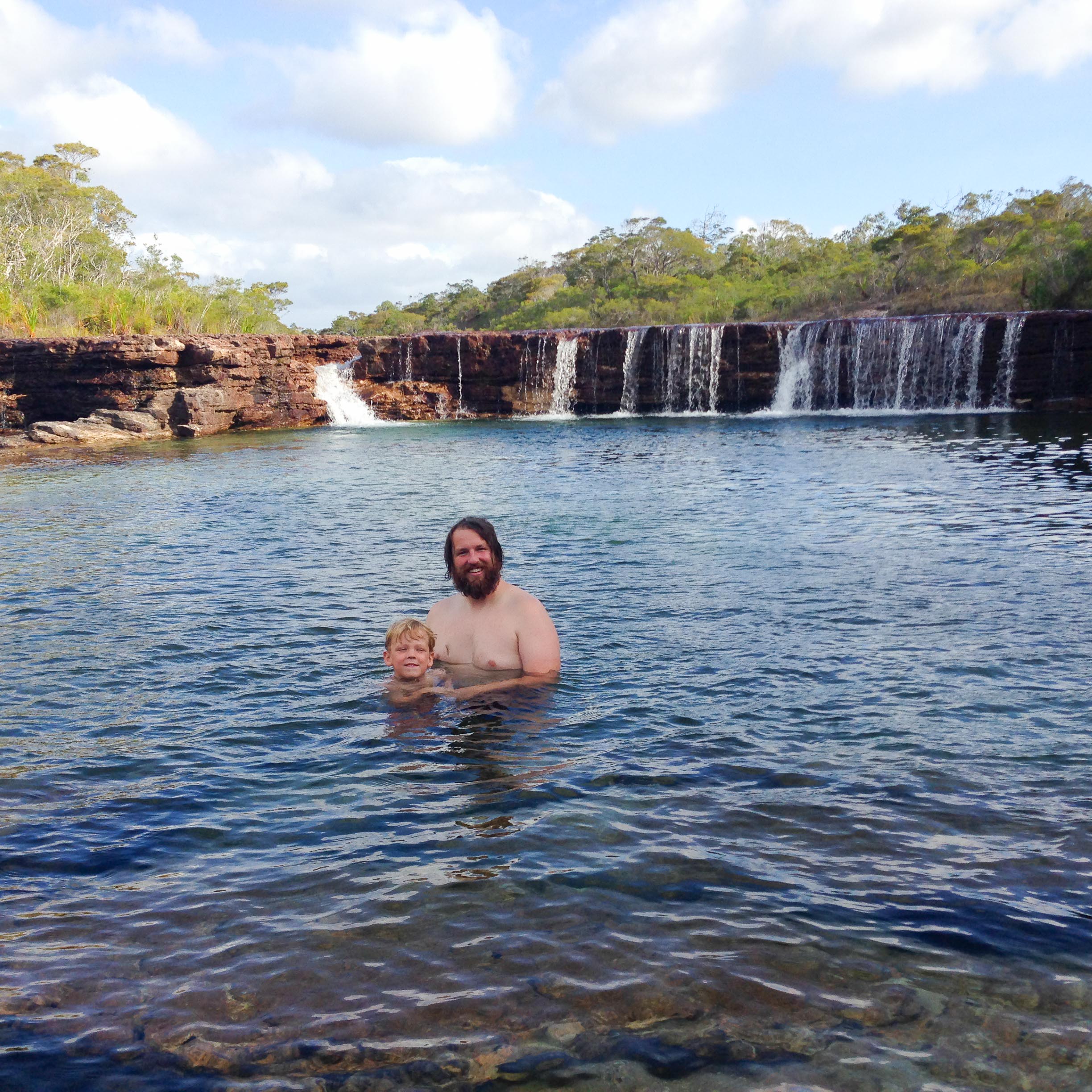 We pulled up to Fruit Bat Falls by late afternoon. This is one of those spots that many people mention as their favorite spot on the journey to the Tip. I was a bit skeptical as it always seems these places can get overhyped – this was not! It was a beautiful wide waterfall with refreshing water. The boys loved traveling around the giant pool on our backs. Miranda and I each took a turn going behind the falls. It was the best shower we had in weeks and left Miranda giddy as the water pounded down on her and swirled around.
