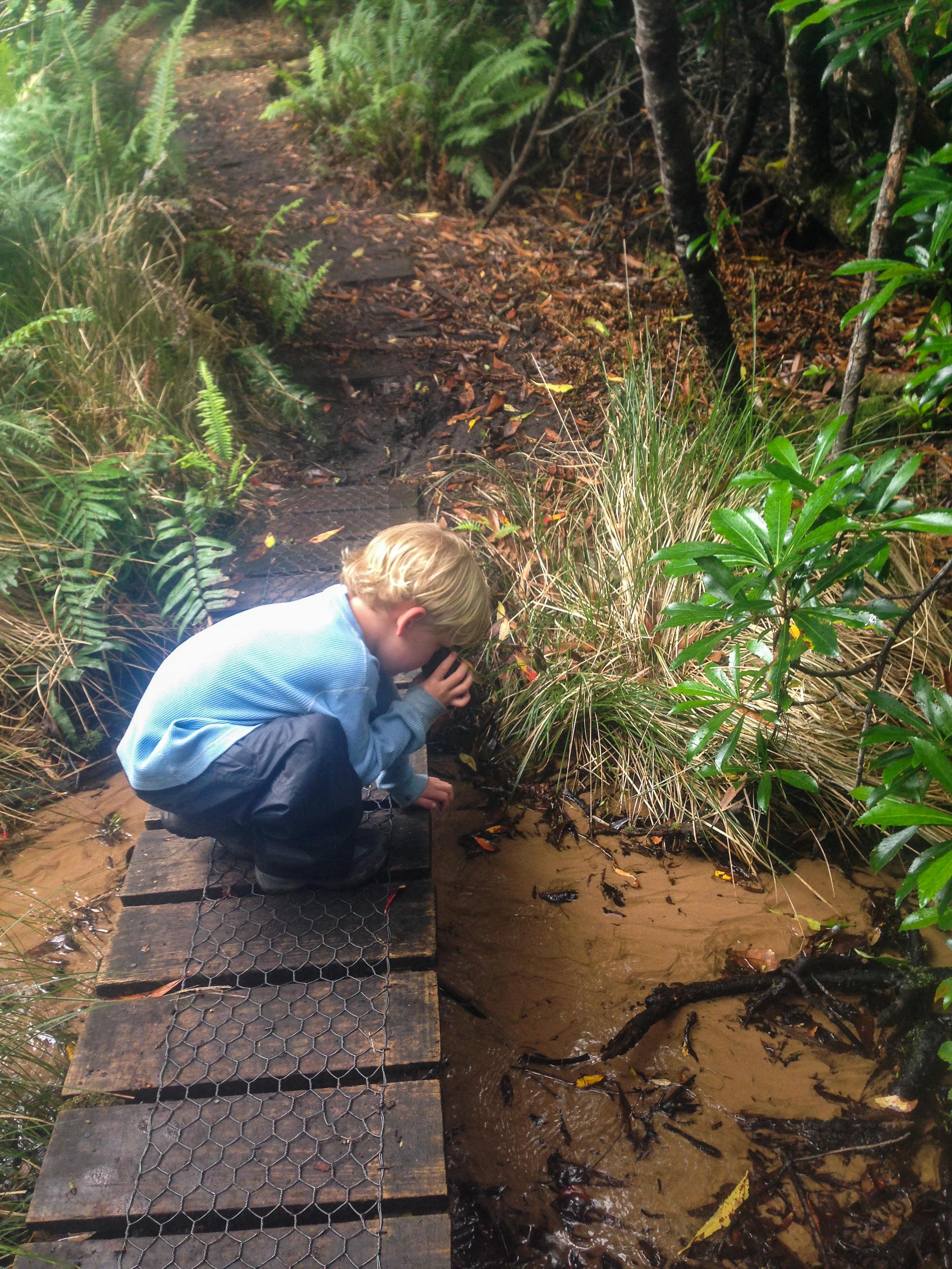 4) Good equipment makes a difference. It makes a difference for adults and it does for kids too. We got the kids good hiking boots, hiking socks, rain jackets, rain pants, and appropriate layers for the conditions. (We were fortunate to find the rain pants at a great second-hand, pop-up shop in Hobart since it rains so frequently here.) For shorter trips, the kids often wear sneakers or hiking sandals, but I think they end up expending a lot of extra energy trying to keep their footing. Adequate footwear reduces this issue. At the end of our hike, Lake told me his boots had “really improved their mud skills” on the trek. He was right! He was able to keep his footing and his feet stayed dry all day in spite of the intermittent rain.