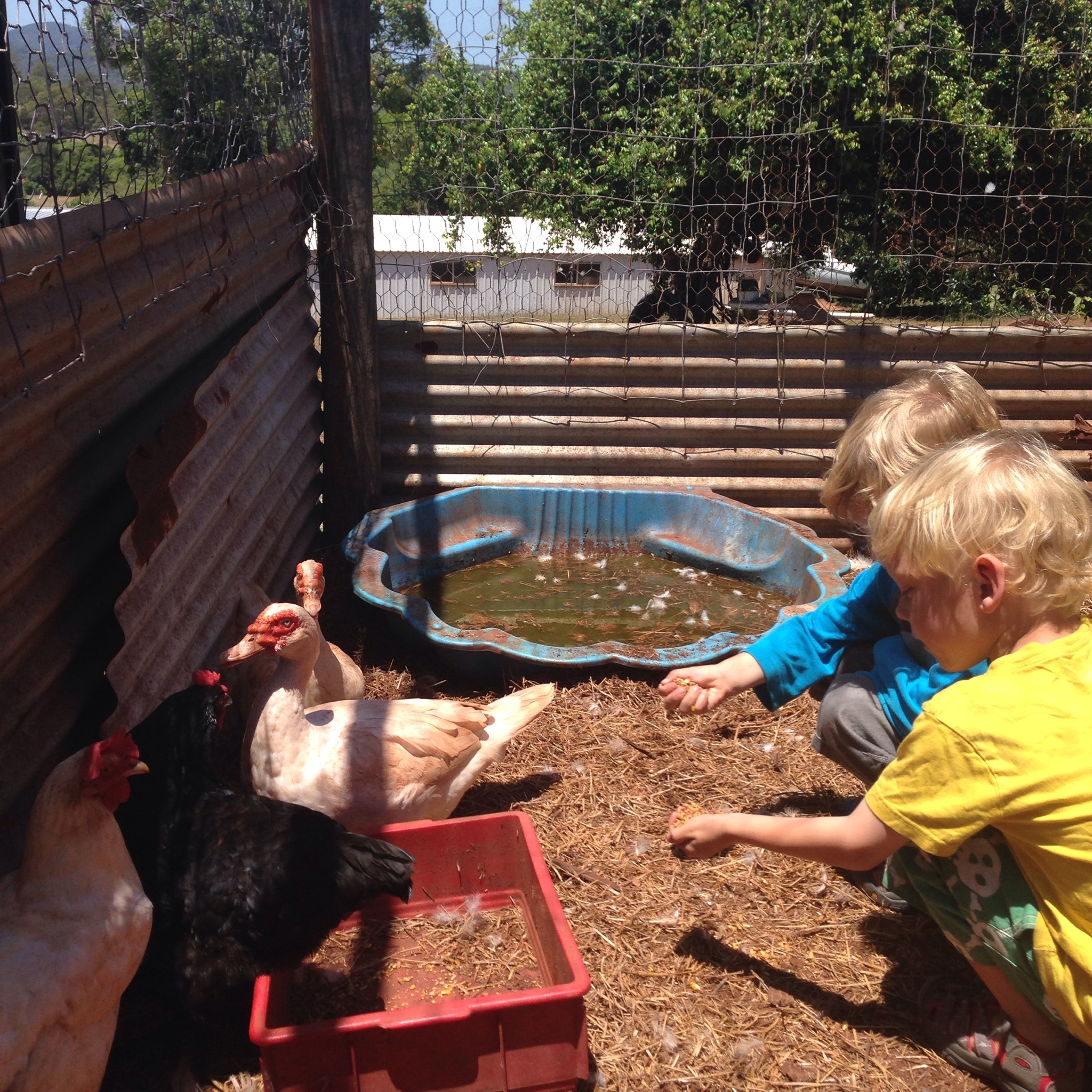 Our morning got off to a quick start as we dove into a bunch of activities designed to engage the boys. They began a bit timid and fearful of Tiny, a very small 12 lb dog. Cameron led us down a hill to where we could all feed the cows on his property. The boys looked skeptically at the cows, tossing food far past the cows rather than feeding them with their hands. When we fed the chooks, the boys started out hiding behind me, but slowly peeked around me to eye the birds. In this case, the feeling was mutual. The birds were apprehensive about the small new visitors to their coop. Fifteen minutes later they were crouching down with the chooks pecking the food from their hands. Their bond grew over the next few days. The boys would enthusiastically head up the small hill with a bag of food scraps in search of fresh eggs. The chooks also adjusted to the boys presence, meeting the boys eagerly at the door to the coop awaiting their morning feed.