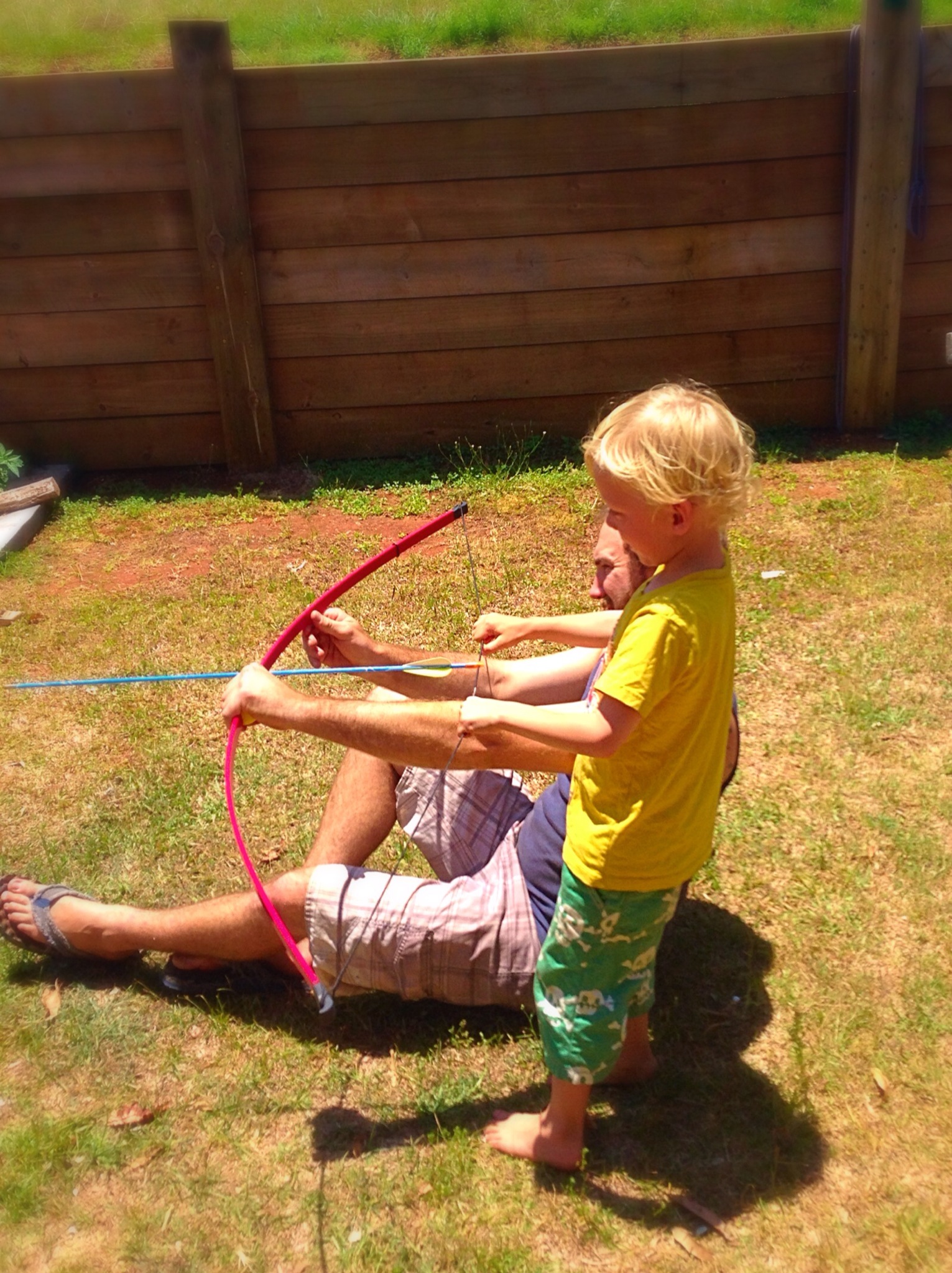 The boys got a bow and arrow lesson while we pulled together lunch. This was quite a treat as the boys had been trying to devise a way to make their own bow and arrows for the previous week at our various stops. I thought that the smile might explode off of their faces as they tried to carefully line up the arrow towards the box target.